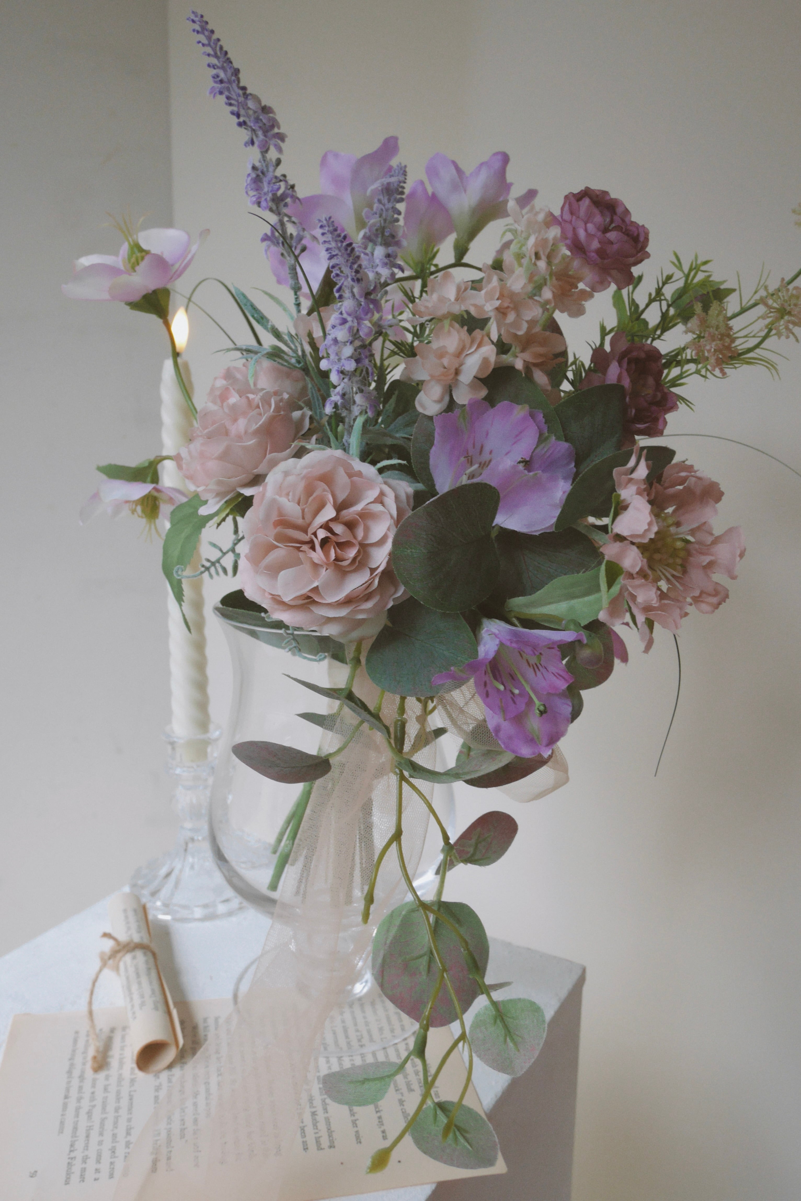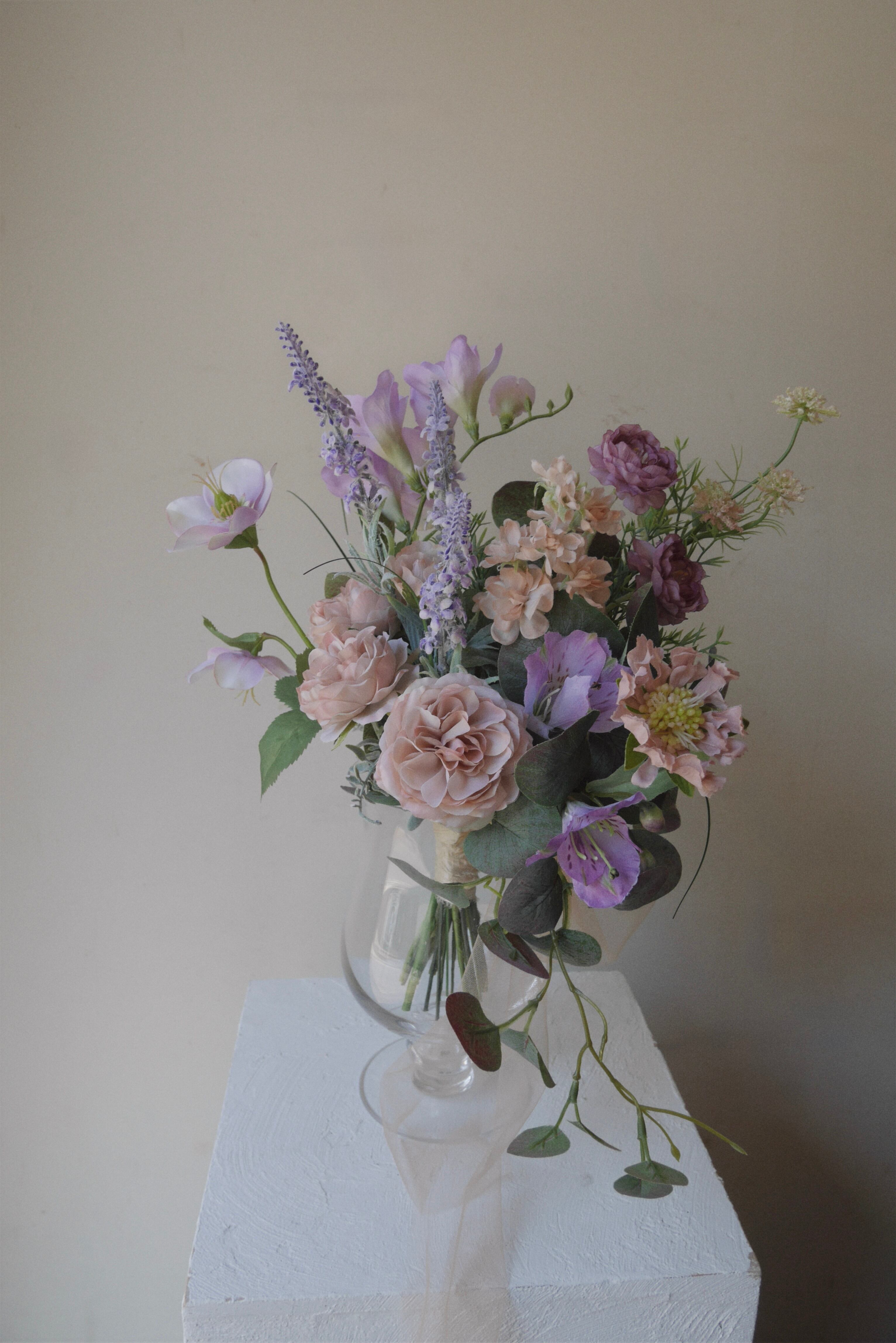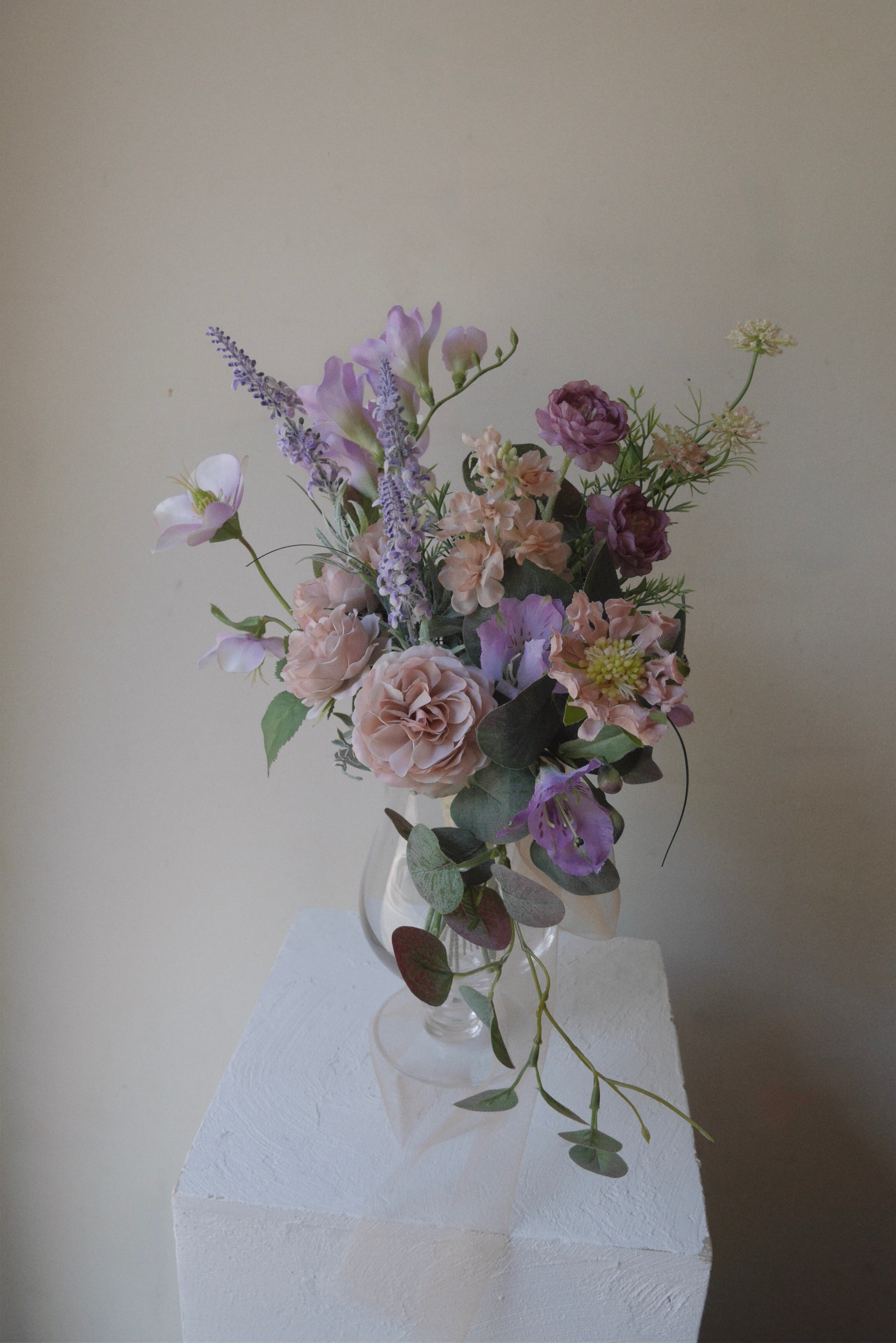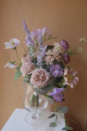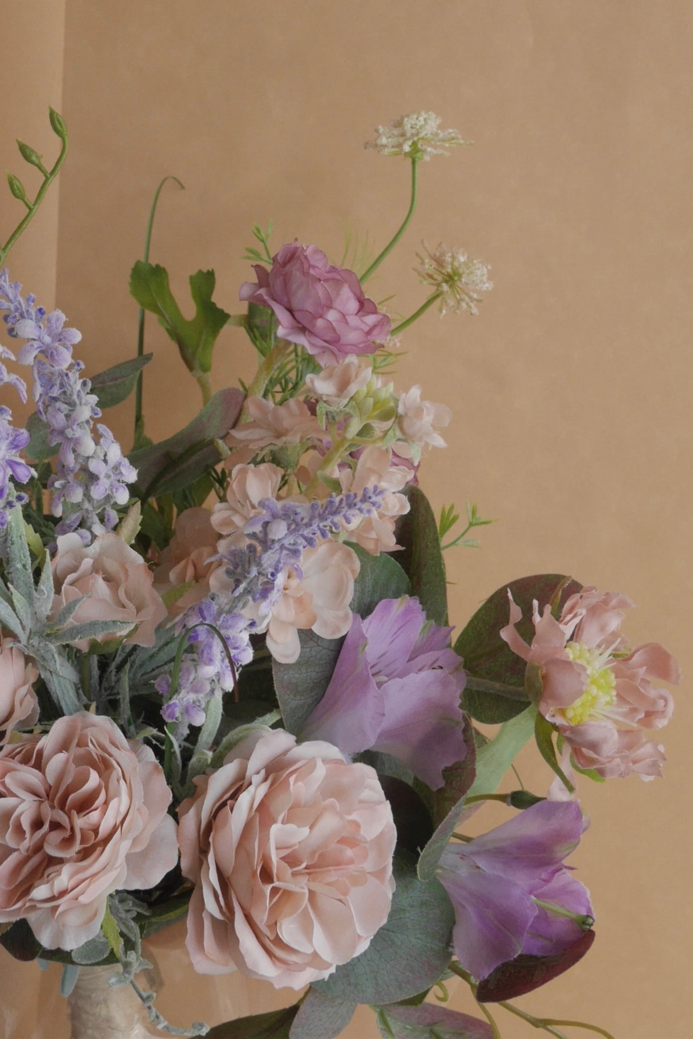 ——くすみピンクのローズに、ライラックやフリージアのやさしい紫を添えて。