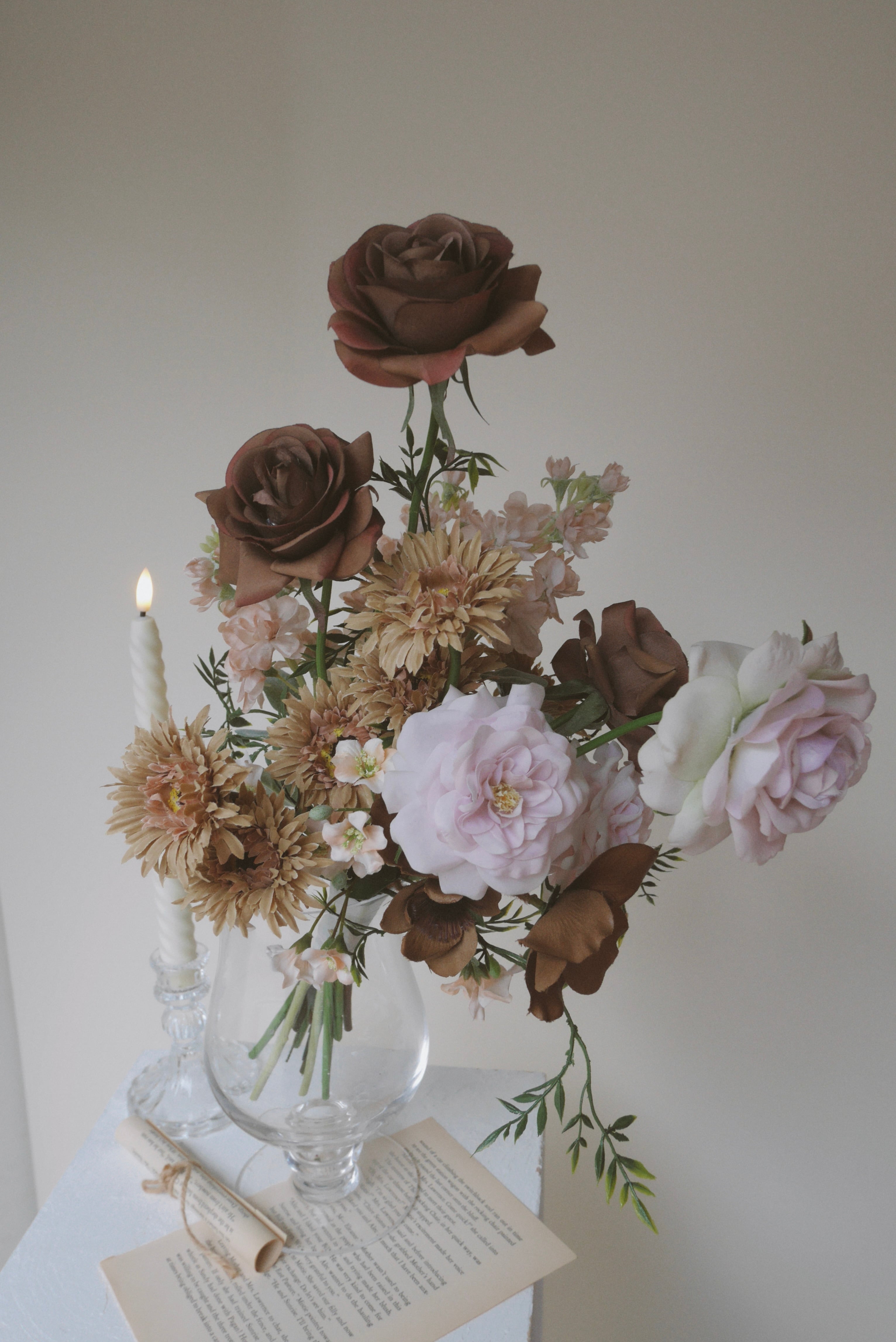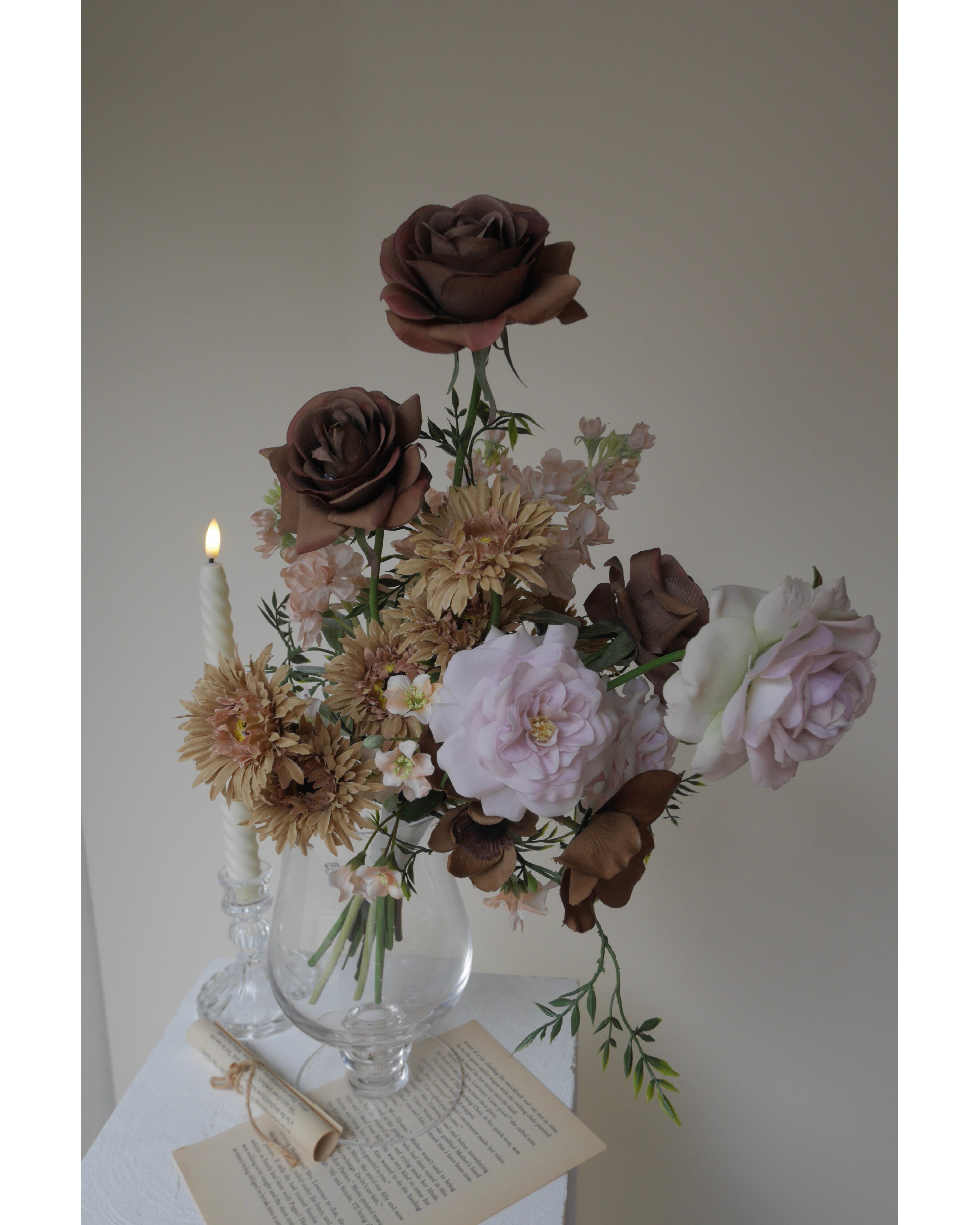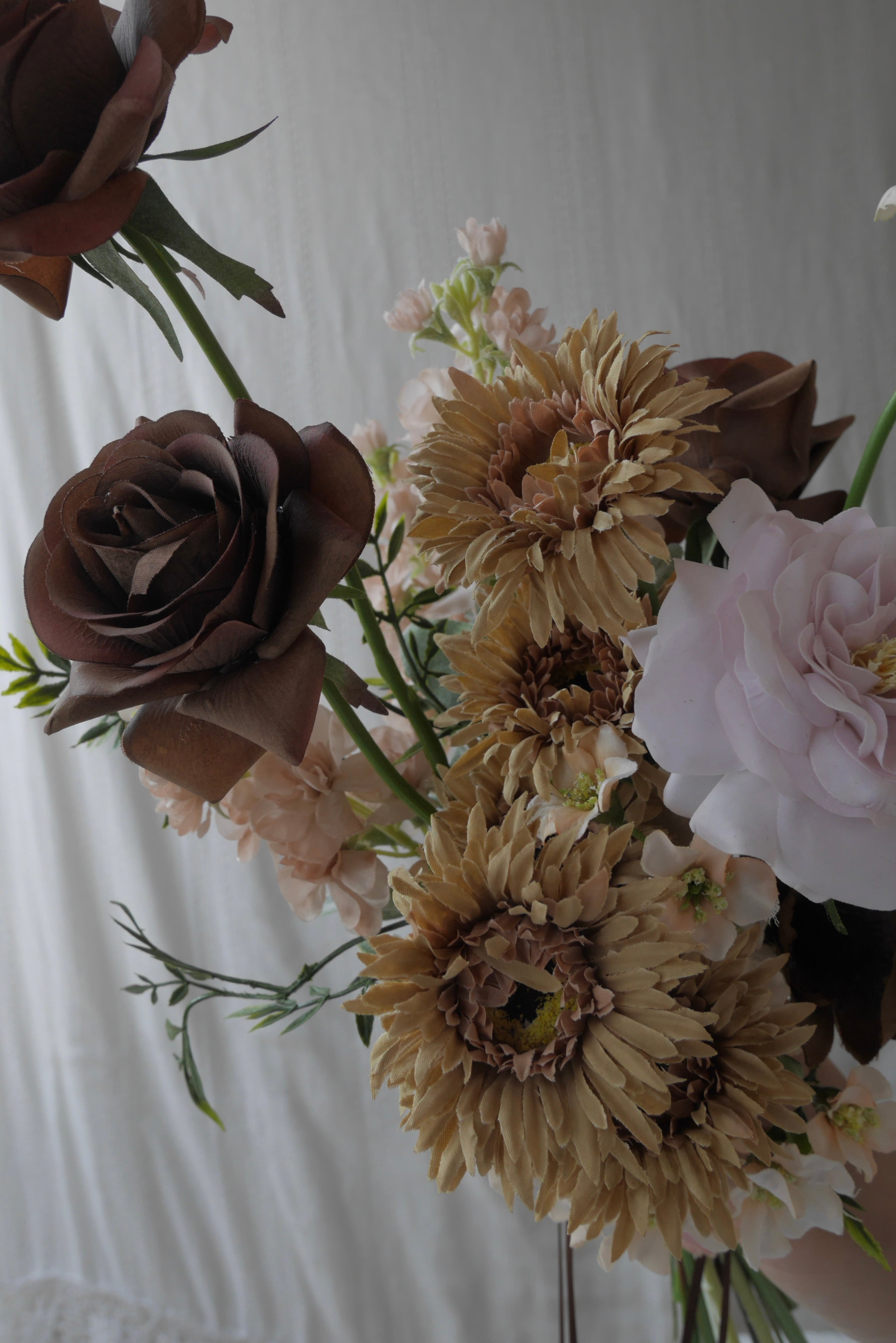 ブラウンとベージュのなかに、ほんのりと忍ばせたピンクがブーケにやわらかな余韻を添えています。