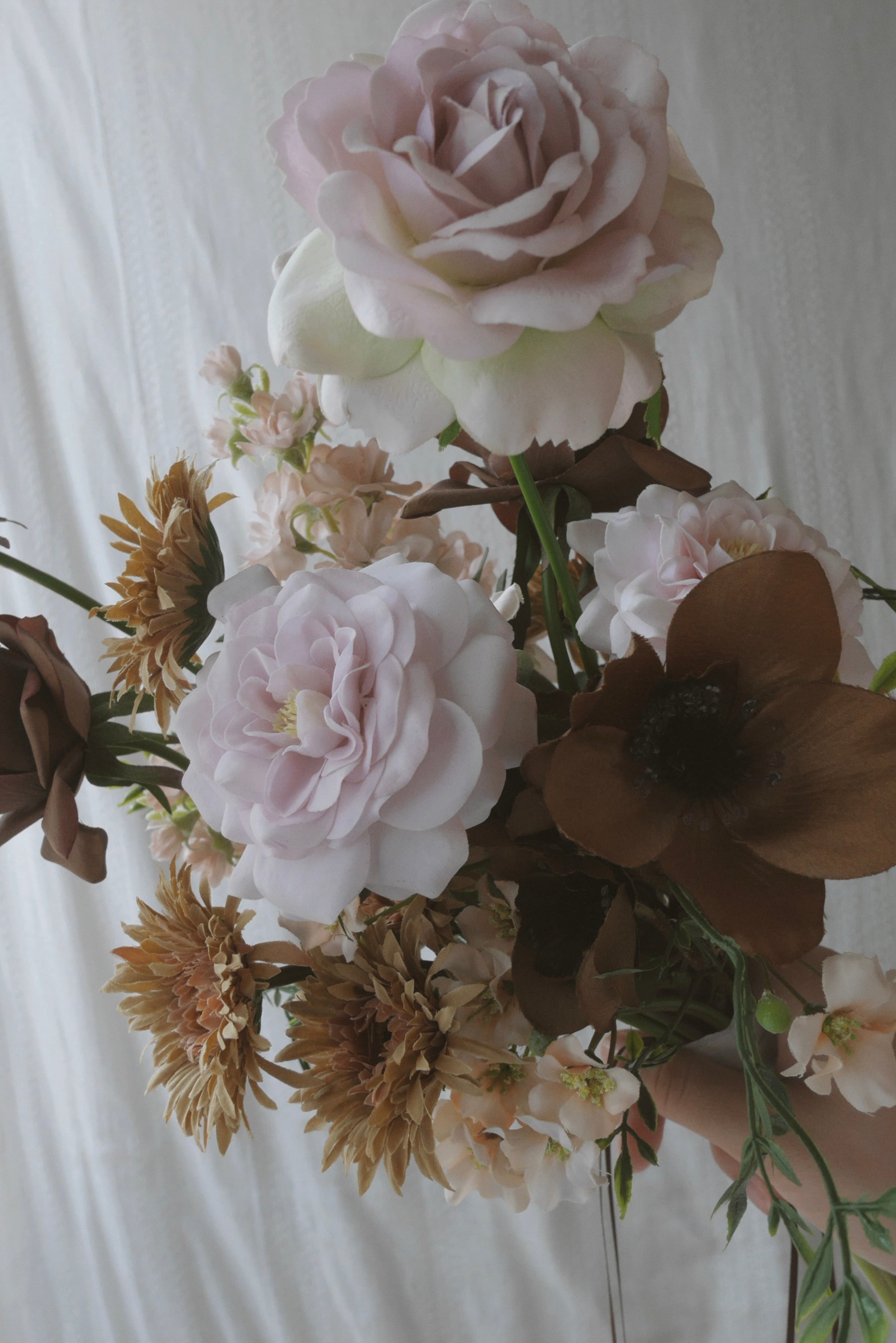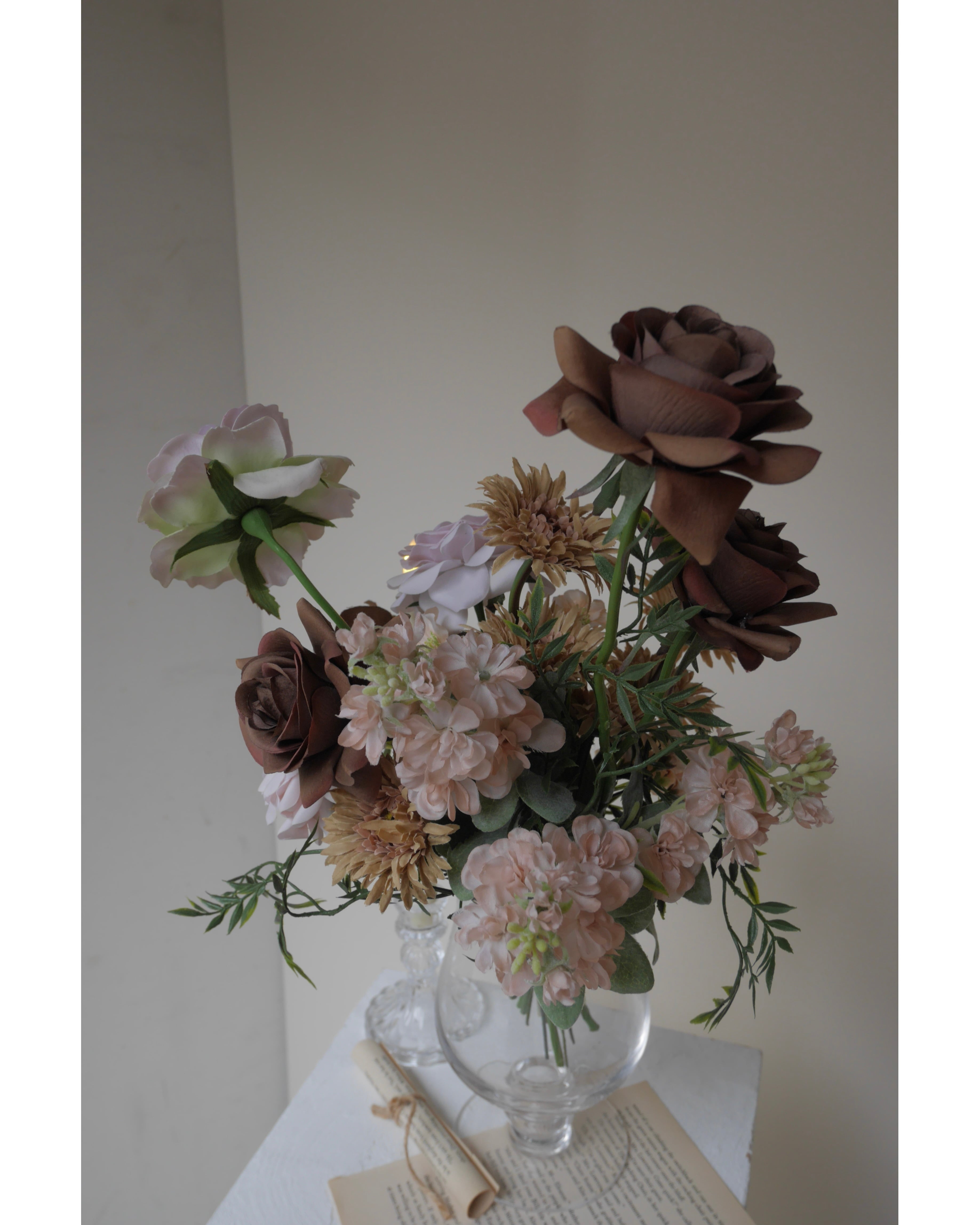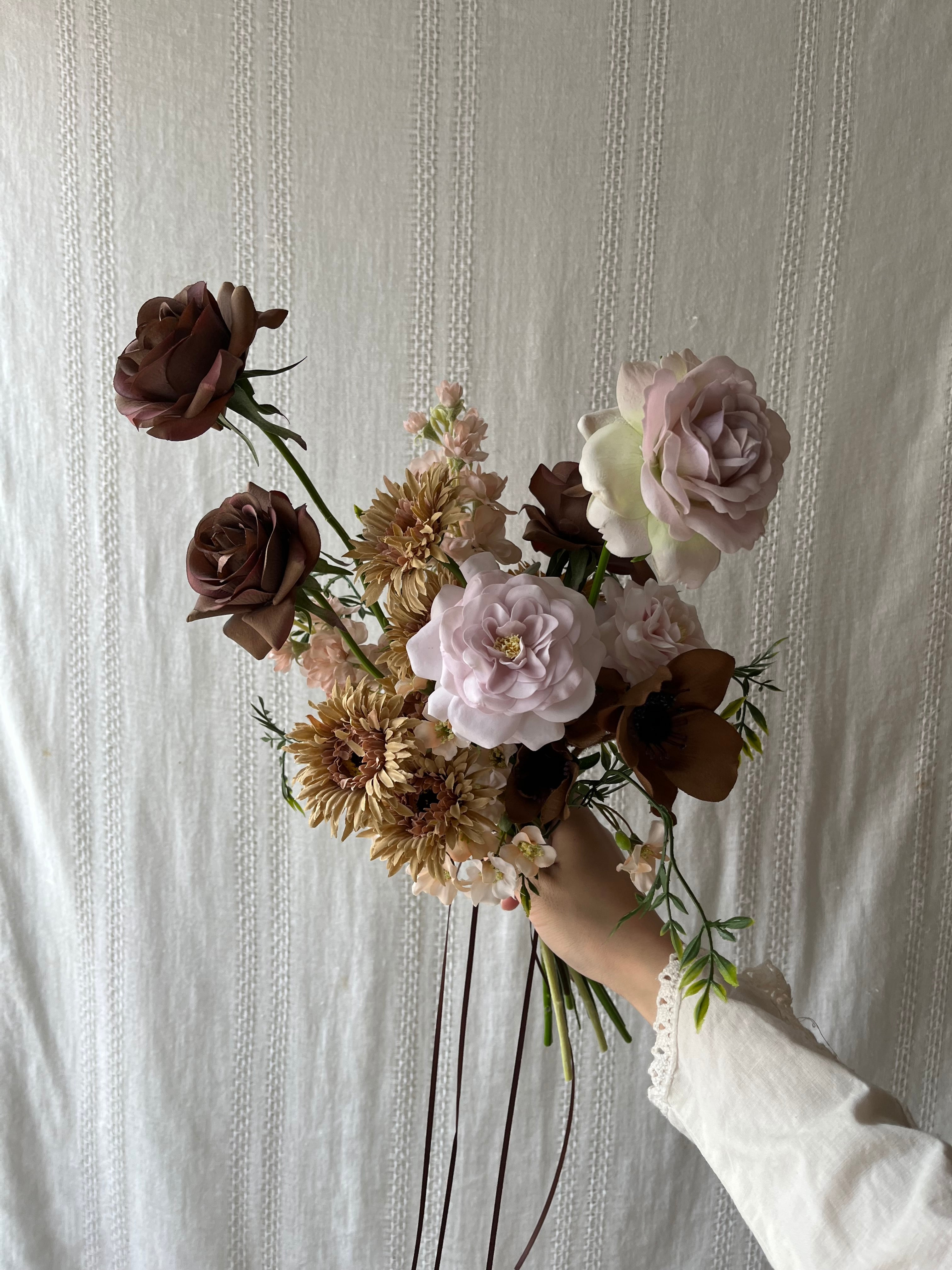 ブラウンとベージュのなかに、ほんのりと忍ばせたピンクがブーケにやわらかな余韻を添えています。