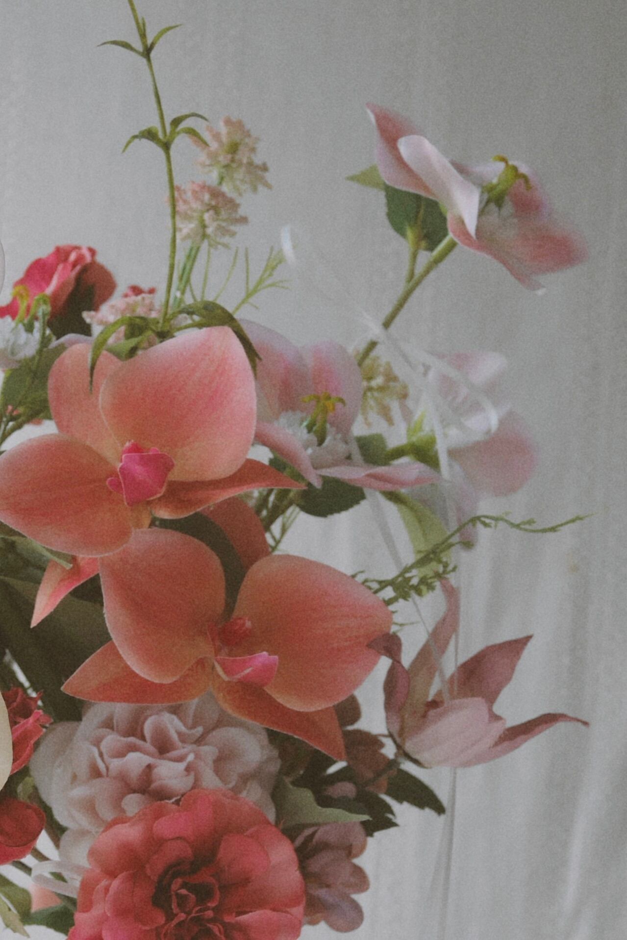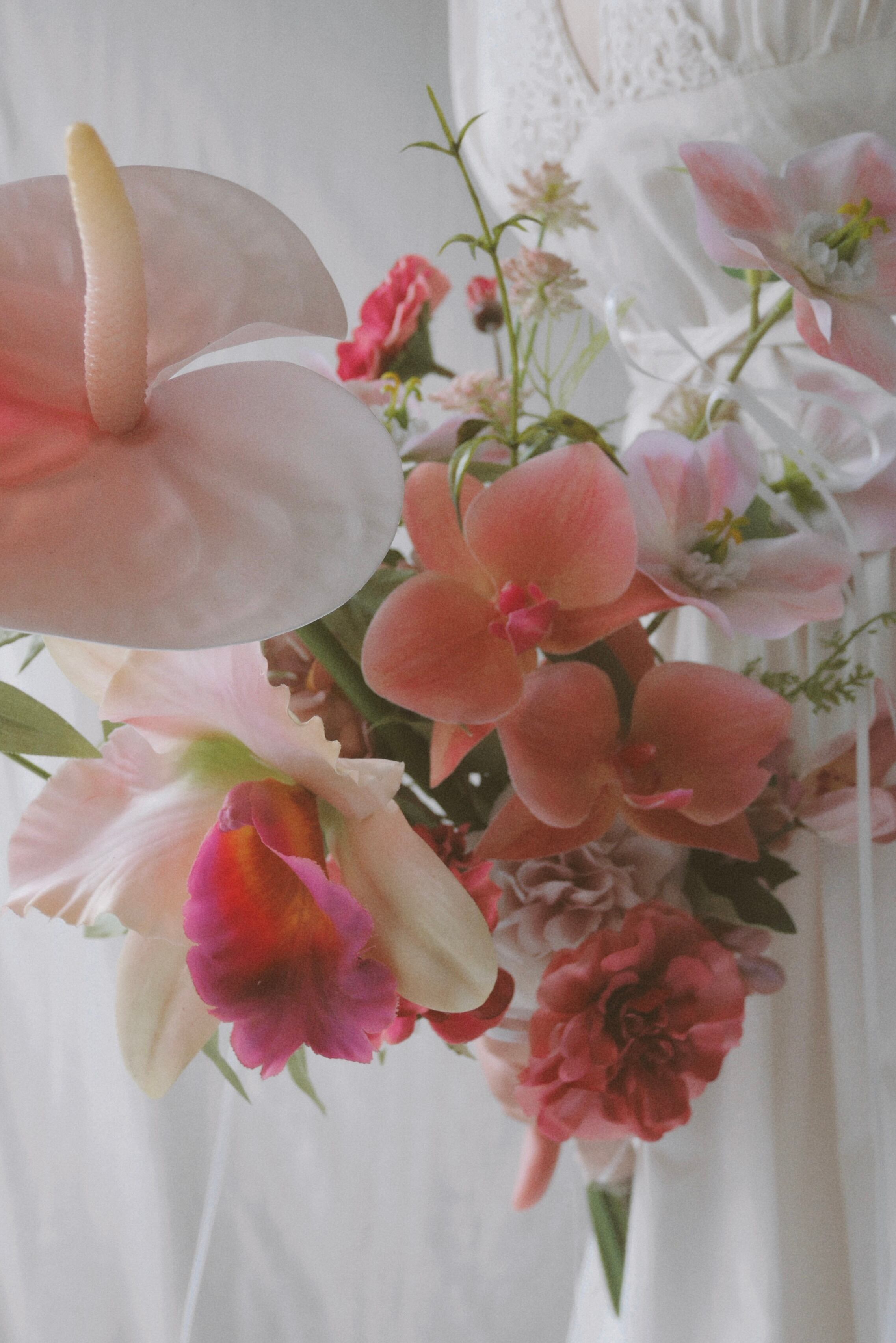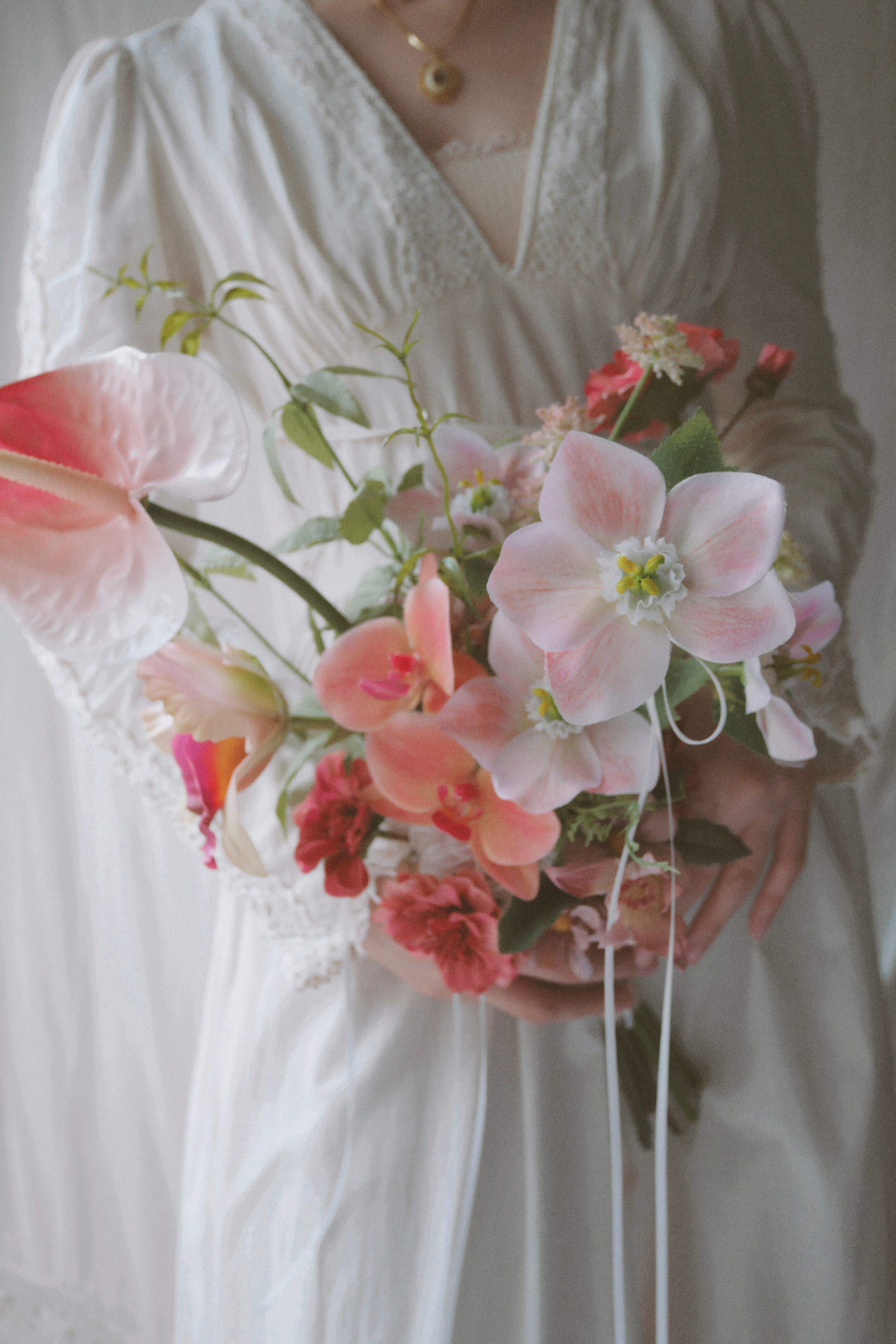 ——やわらかなコーラルピンクに光が差し込むような、上品であたたかなブーケ。