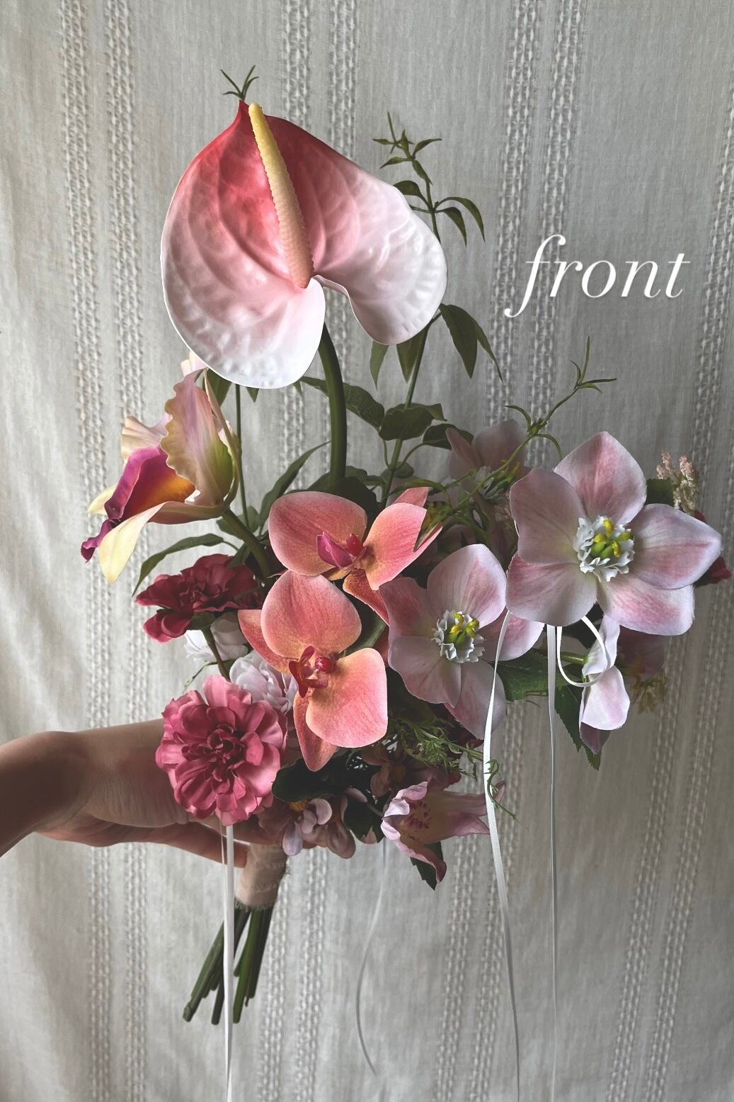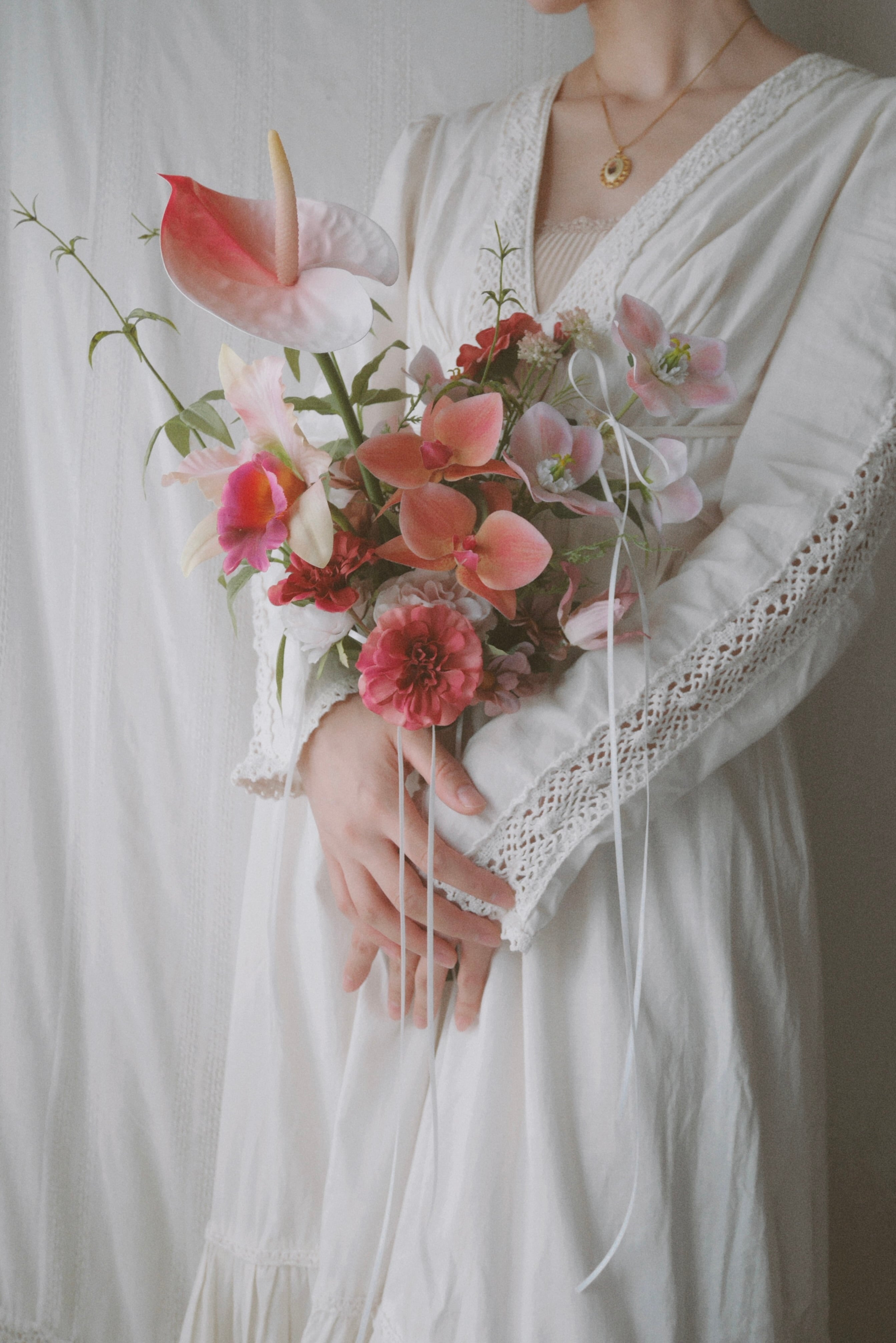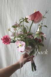 持ち手には透け感のあるオーガンジーリボンを、花々には細いサテンリボンを結び、軽やかで洗練された仕上がりに。