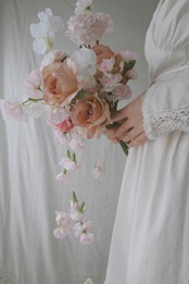 淡いピンクとホワイトの花々が重なり合い、まるで花がこぼれ落ちるようにあしらった、躍動感のあるデザインです。