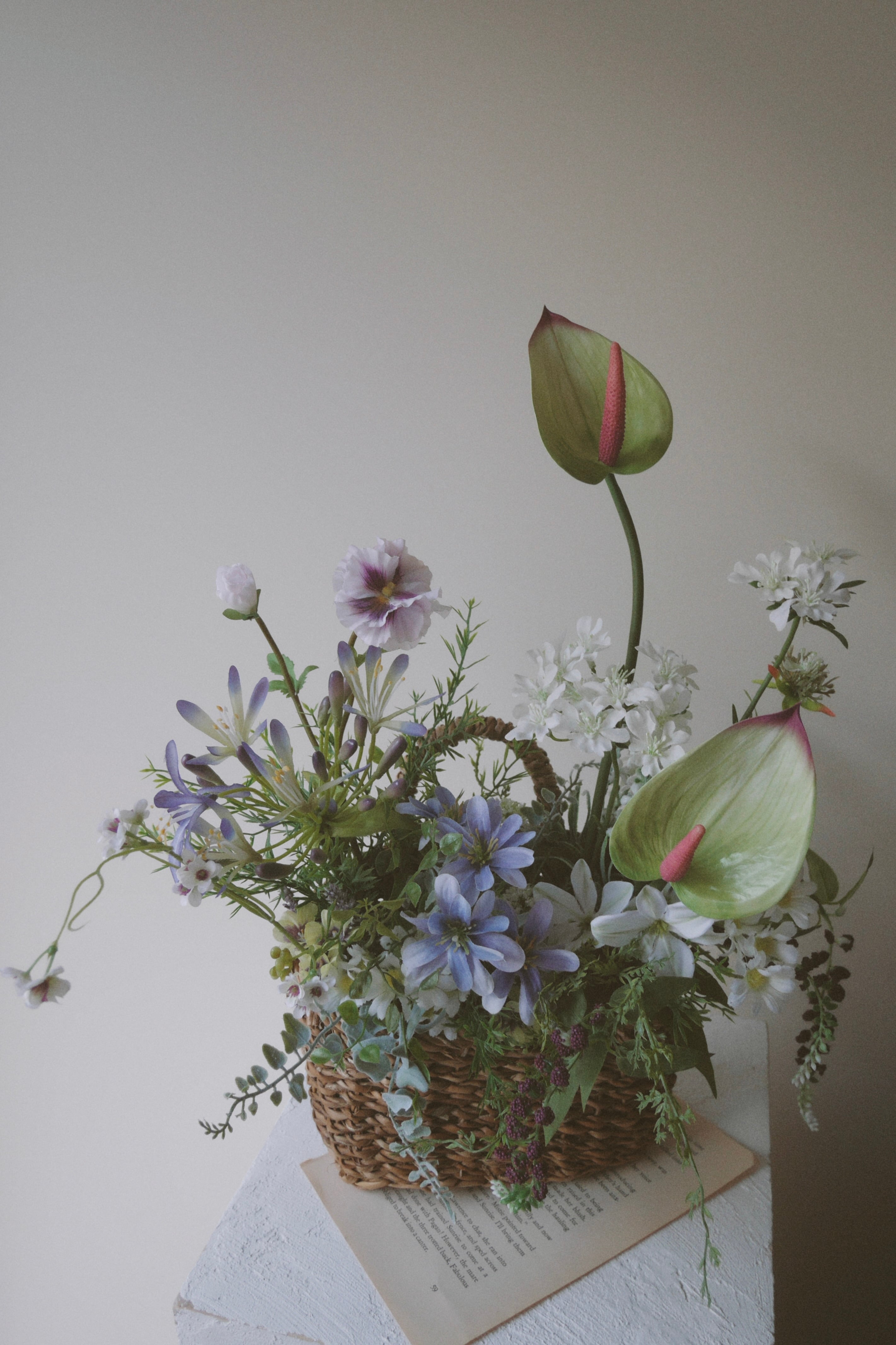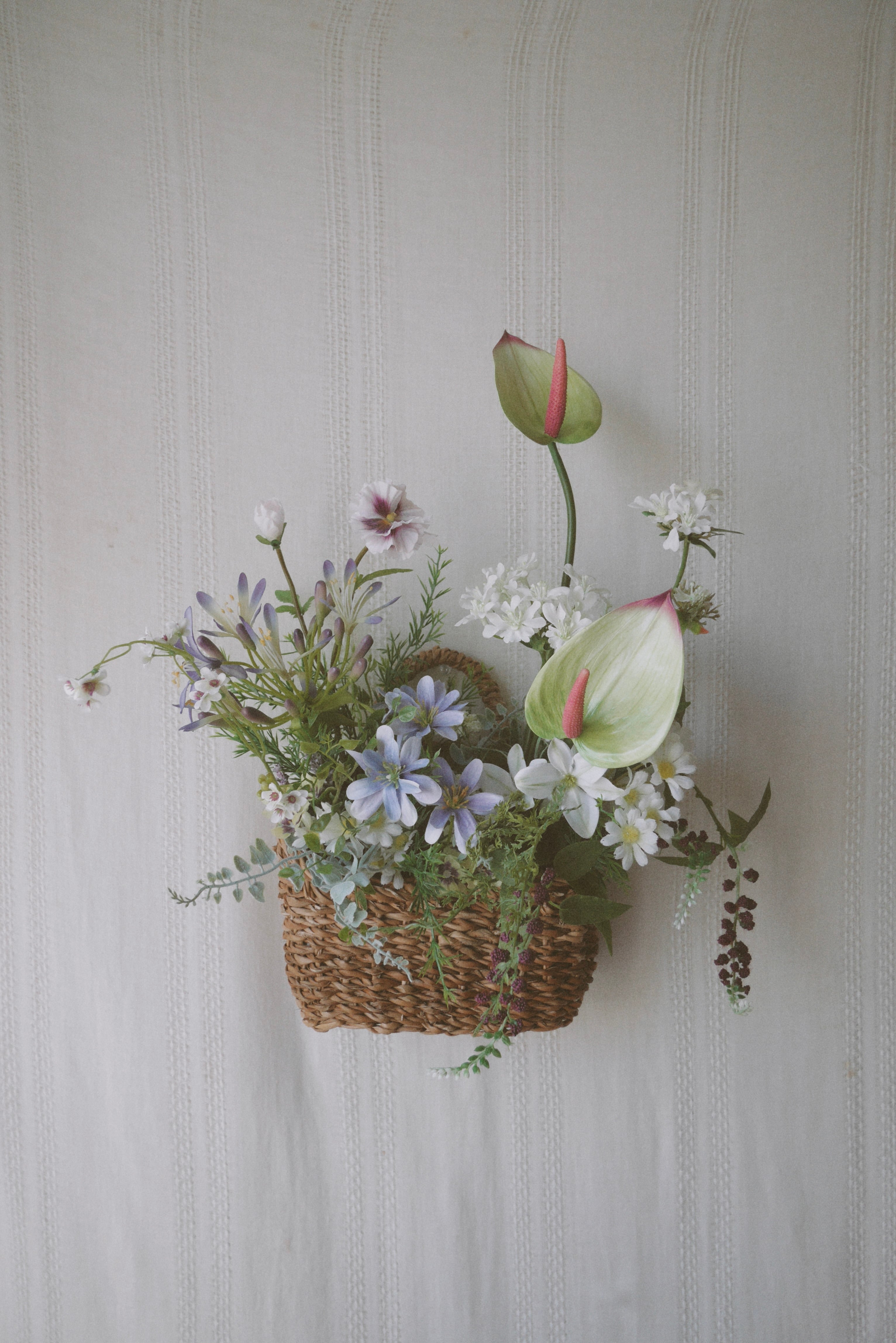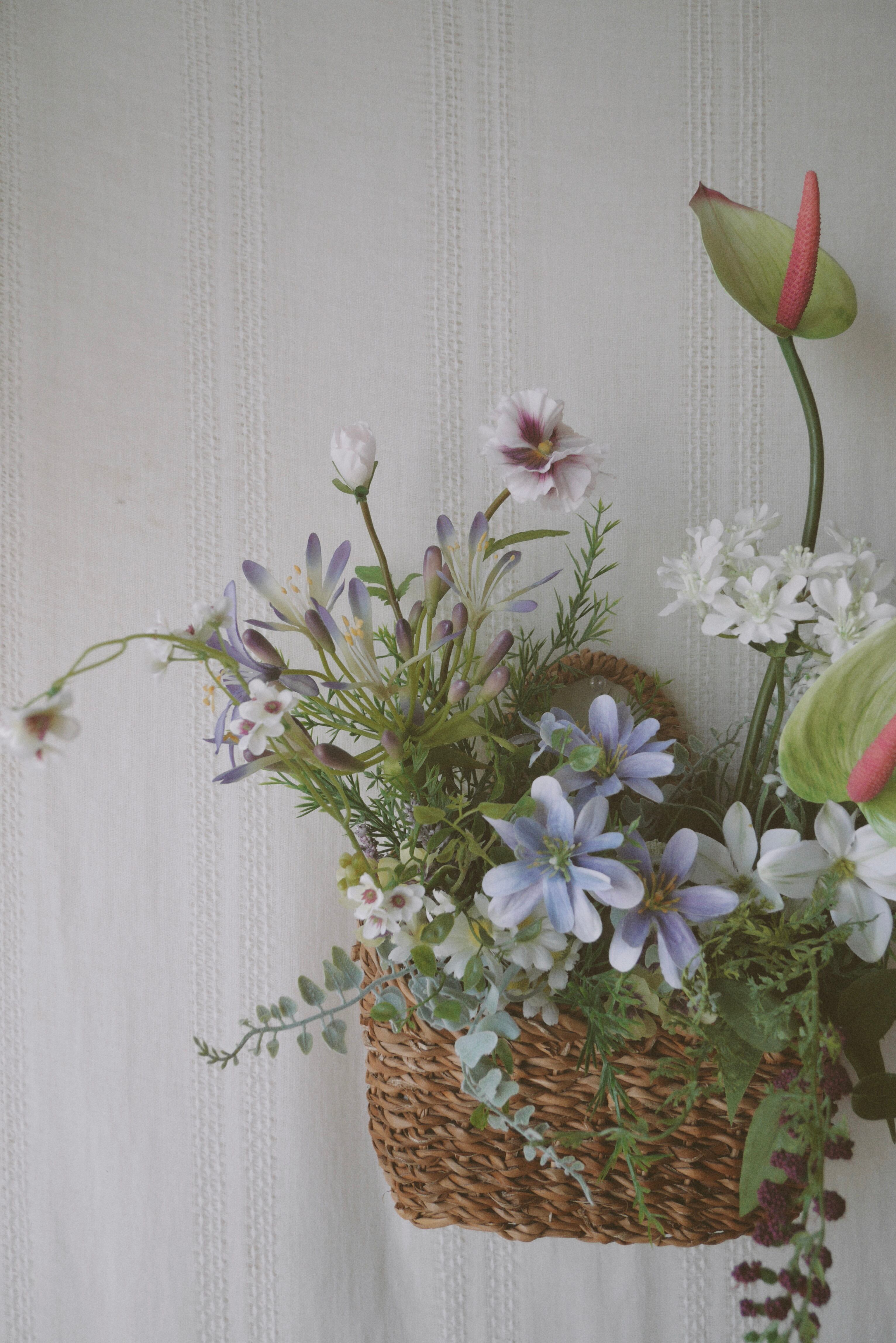 —— アンティーク調のバスケットに、やわらかな風を感じるような花々を束ねました。