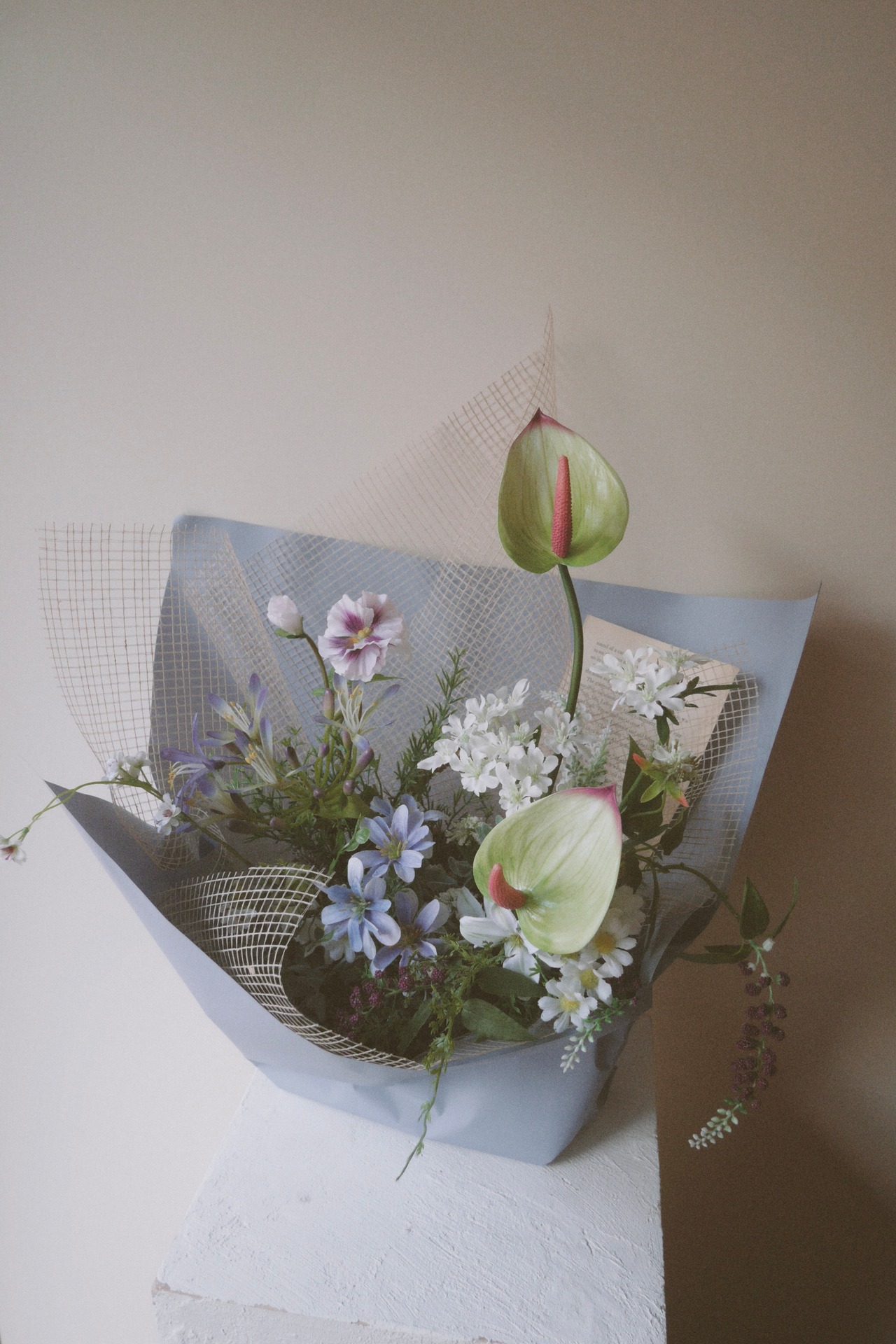 淡いブルーやホワイトの花に、アンスリウムのグリーンとピンクがアクセント。